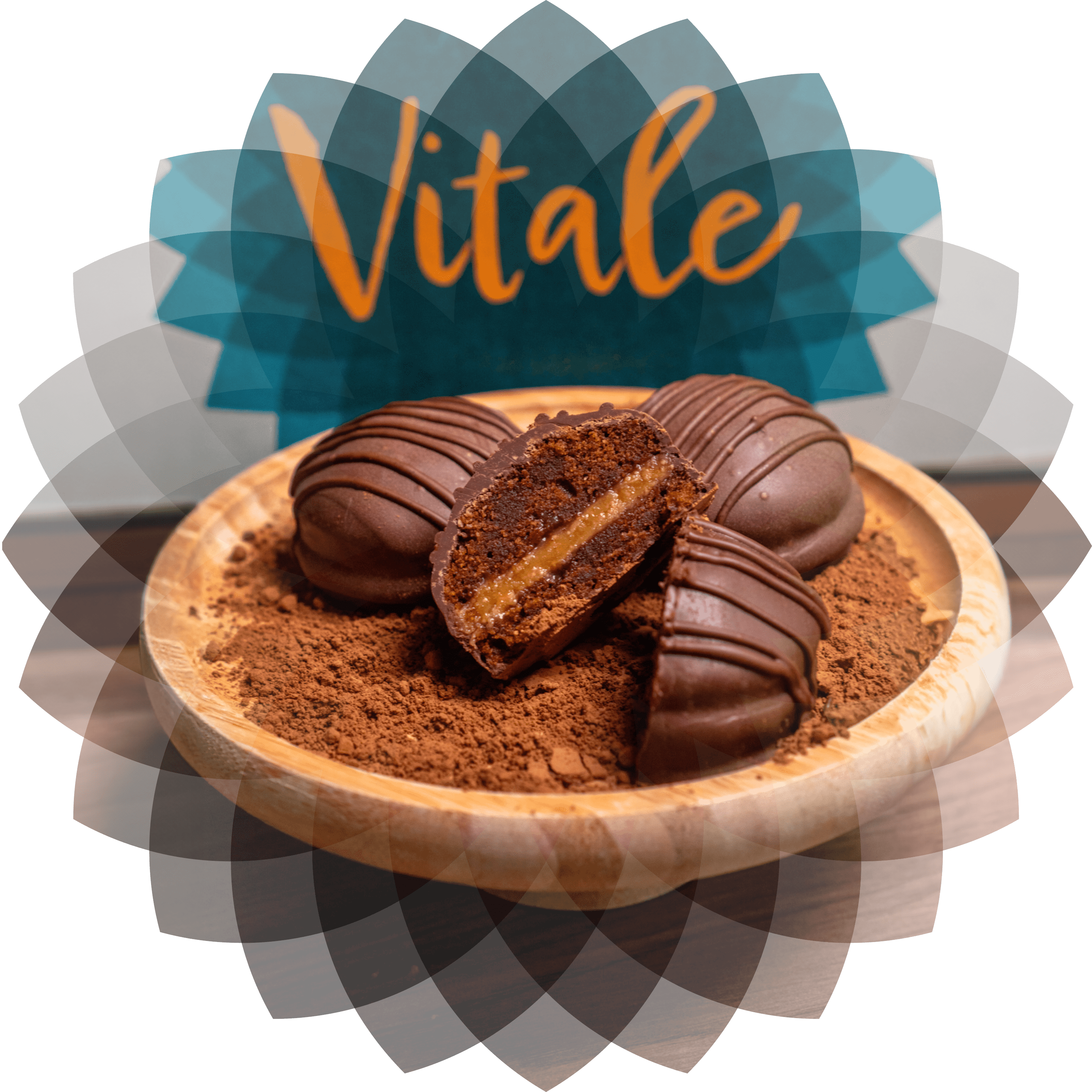 Ingredientes: proteína vegetal, chocolate branco 0 açúcar, farinha de amêndoas e mel de tâmaras